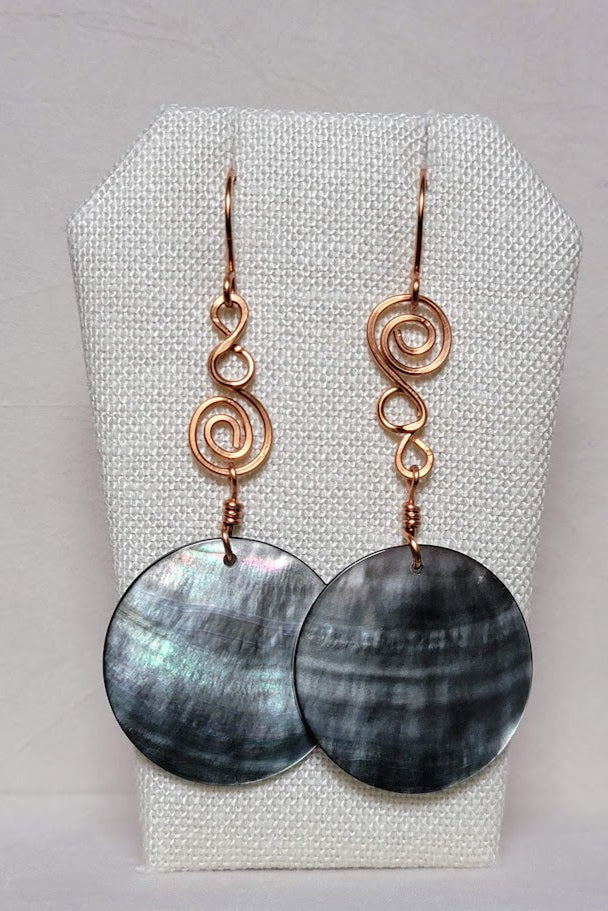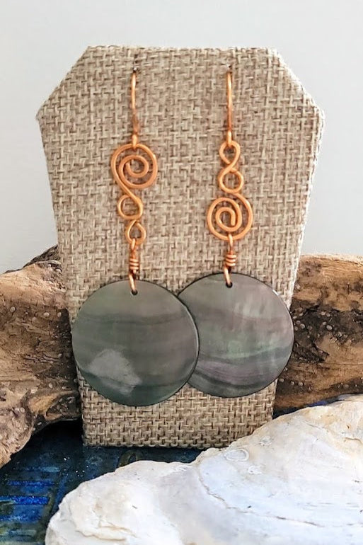 Shimmering like a hidden moon behind a veil of sea mist, Eclipsed Tides brings together swirling copper energy and the dark elegance of natural shell. Each disc catches light with an iridescent gleam—like tides pulled under eclipse—while hand-forged copper spirals echo the mystic motion of the ocean’s pull.