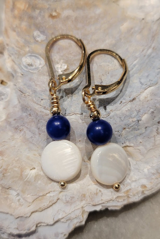 Whispers of the deep, captured in gold and stone. The Ocean Oracle earrings pair luminous capiz shell with the rich midnight blue of lapis, crowned in gold-filled elegance—a talisman for sea dreamers and star seekers alike.